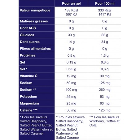 Chaque gel apporte 33 g de glucides, avec ou sans caféine selon la saveur.