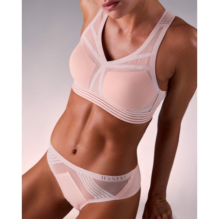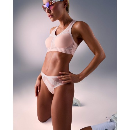 Un Tanga technique de sport qui n'oublie pas d'être élégant avec ses jeux de transparence en tulle stretch et ses finitions velvet touch.