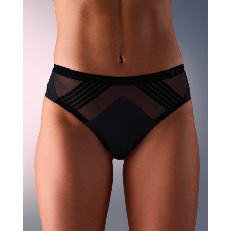 Un Tanga technique de sport qui n'oublie pas d'être élégant avec ses jeux de transparence en tulle stretch et ses finitions velvet touch.